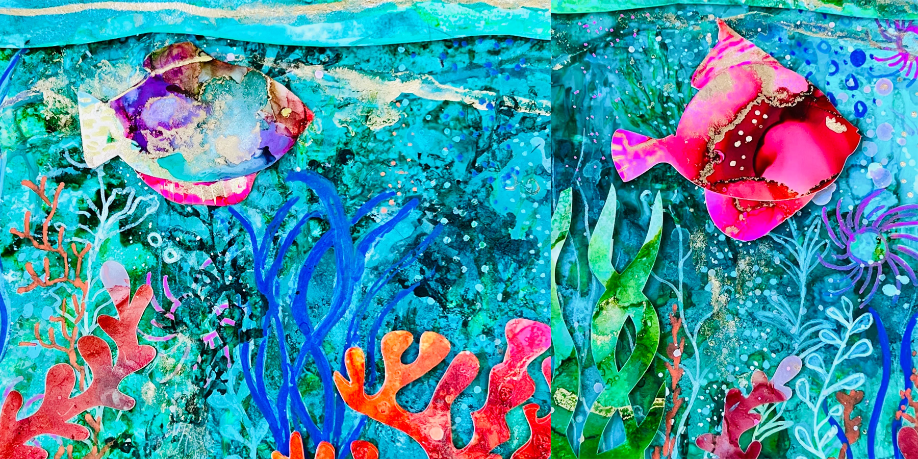 Sale price $ 175.00A fantastical underwater world. Shimmering fish happily swim among the seaweed and coral. Shades of blues, and greens, created the Ocean colors for the background of this piece. Many hand-drawn and stamped layers were added to create depth and layers. 3D Collage elements were created using alcohol ink scraps from earlier works. Mixed media alcohol inks, acrylic ink, and paint pens. 11x14x2. Mounted on...Sold out -