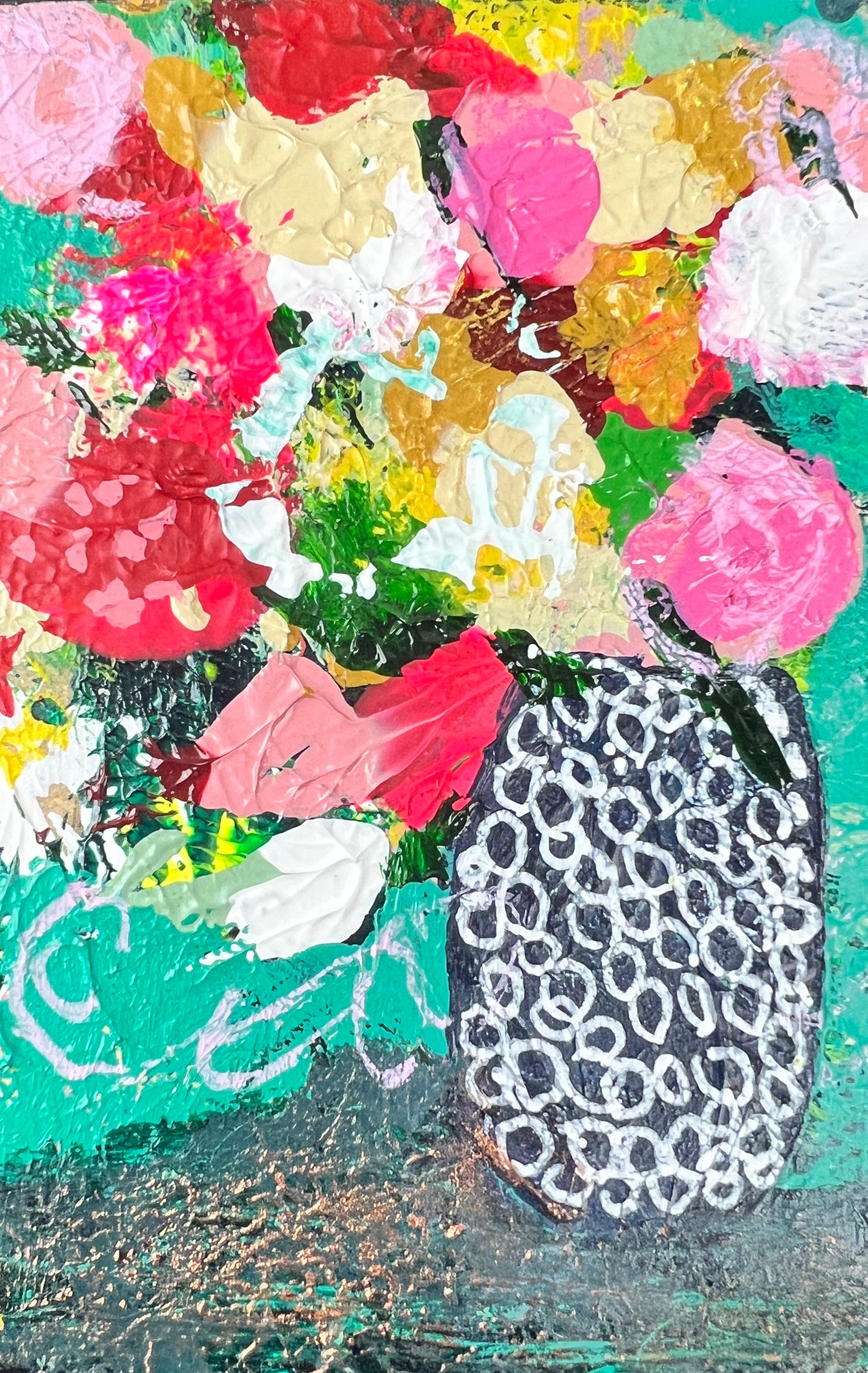 A fun collection of whimsical abstract floral abstracts with lots of color and textured layers. The little vases just make me smile :)