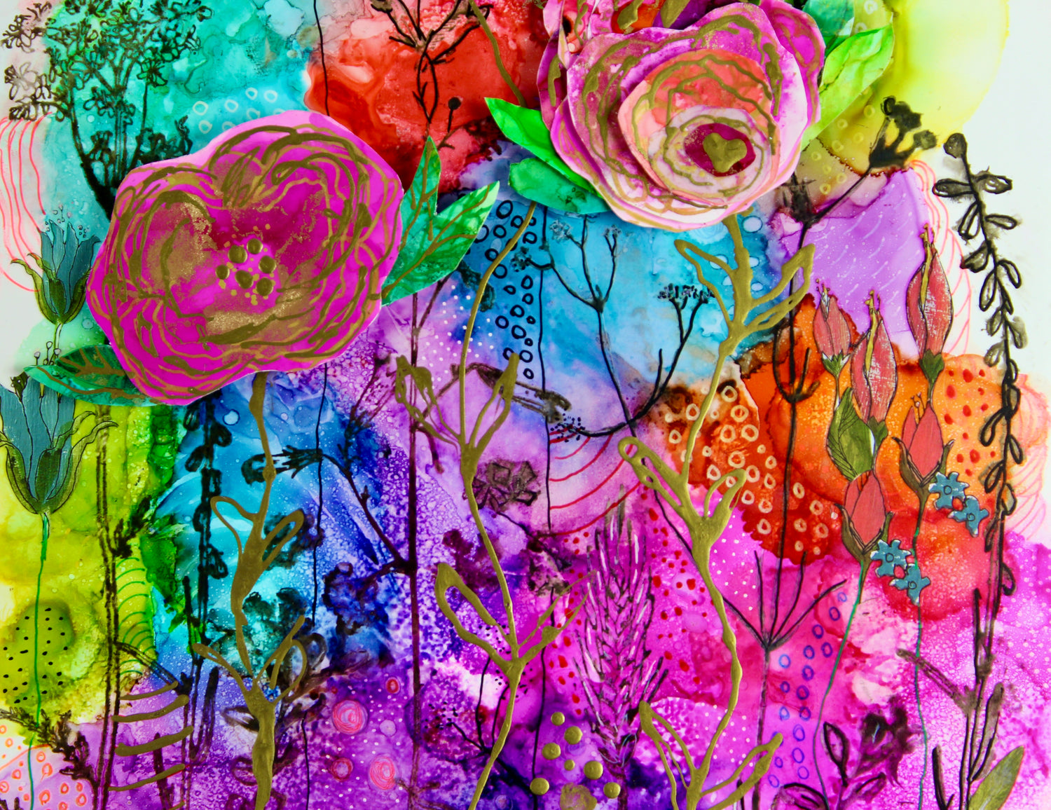 Mixed media Collage, alcohol inks, acrylic ink, and paint pens. 11x14x2